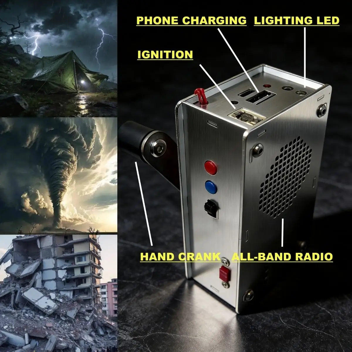 The ultimate off-grid companion for your bug-out bag. Generate your own electricity, start fires in the wind, and stay informed with the radio—all without a single drop of fuel.